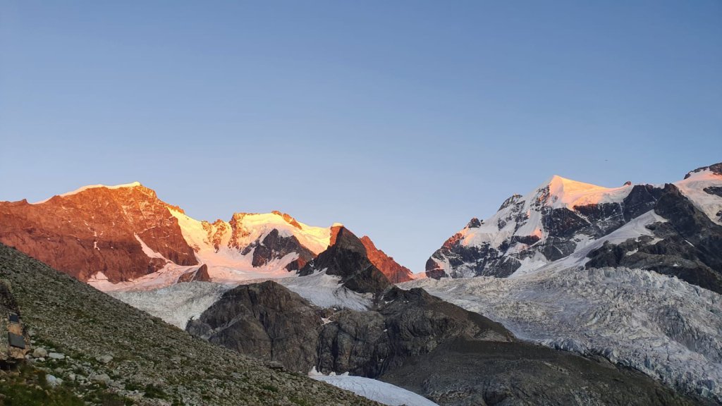 Während der nächsten Tagesetappe gab es endlich wieder Empfang und nach einigen Telefonaten und einem guten Stück Kuchen fehlte noch der letzte Aufstieg mit Blick auf den Morteratschgeltscher zur Boval Hütte. Erstmalig wurde die Gruppe an hungrigen Jugendlichen nicht satt (zwar gibt es in Österreich nur drei Gänge, dafür ausnahmslos genug Nachschlag).