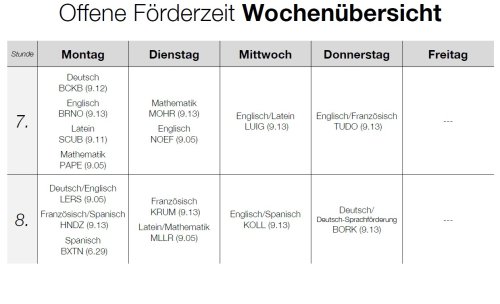 Aktueller FörderplanHier finden Sie die aktuellen Förderzeiten und Räume der Fächer Mathe, Deutsch, Englisch, Französisch, Latein und Spanisch. Die Anmeldung erfolgt i.d.R. über den Fachlehrer, eine freiwillige Teilnahme ist aber ebenfalls jederzeit möglich. Beispielsweise vor Klassenarbeiten hat man die Möglichkeiten, häufiger pro Woche am Förderunterricht teilzunehmen.