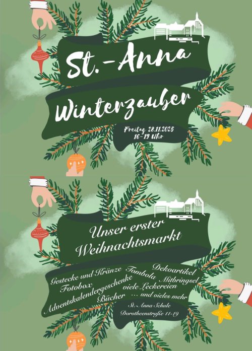 Lasst den "Winterzauber" beginnenVorweihnachtliches Fest an St. Anna am 28.11.2025Nach "Anna Live" ist vor dem "Winterzauber"! Wie sich ja bereits herum gesprochen hat, wird es in diesem Jahr, am Freitag, dem 28.11.2025, und zwar von von 16 Uhr bis 19 Uhr, unseren ersten "Winterzauber"-Weihnachtsmarkt an St. Anna geben! Die "Altvorderen" unter den St.-Anna-Kennern werden sich gewiss noch an die Basare erinnern, die alle zwei Jahre die Schulgemeinde mit großerr Begeisterung versetzte und das gesamte Schulgebäude und -gelände, vom Keller bis zum Dach, mit prallem, vorweihnachtlichen Leben erfüllte. |