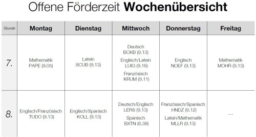 Aktueller FörderplanHier finden Sie die aktuellen Förderzeiten und Räume der Fächer Mathe, Deutsch, Englisch, Französisch, Latein und Spanisch. Die Anmeldung erfolgt i.d.R. über den Fachlehrer, eine freiwillige Teilnahme ist aber ebenfalls jederzeit möglich. Beispielsweise vor Klassenarbeiten hat man die Möglichkeiten, häufiger pro Woche am Förderunterricht teilzunehmen.