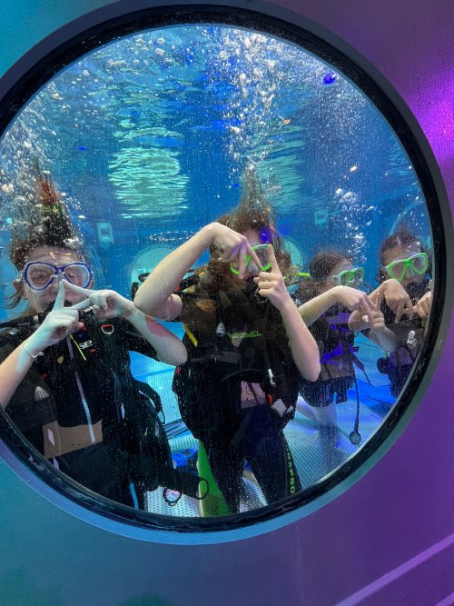 Wasserabenteuer pur:Unsere Sportexkursion zur Boot Messe DüsseldorfAm 23. Januar ging es für unsere Klasse zur Boot Messe in Düsseldorf, wo uns ein Tag voller spannender Aktivitäten erwartete. Als erste Aktivität auf dem Tagesplan ging es für uns zum Tauchbecken, wo die meisten von uns das erste Mal in ihrem Leben Flaschentauchen ausprobieren durften. Dort wurden wir von den netten Mitarbeitern empfangen und in Kleingruppen aufgeteilt. Die erste Gruppe durfte auch schon die dort bereitgestellten Neoprenanzüge anziehen. Aber bevor wir ins Wasser gehen durften, wurden uns die wichtigsten Regeln, Funktionen unserer Tauchwesten und die wichtigsten Handzeichen gezeigt und erklärt. Danach ging es für uns endlich mit den Tauchflaschen und Tauchwesten auf die Plattform. Mit Taucherbrille, Weste und Flossen bewaffnet, wurden uns der Reihe nach ins Wasser geholfen. Bevor die Tauchlehrer uns abtauchen ließen, zeigten sie uns wie man einen Druckausgleich unter Wasser macht. Denn das ist trotz der geringen Tiefe sehr wichtig. Langsam ging es dann endlich unter Wasser. |