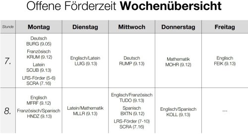 Hier finden Sie die aktuellen Förderzeiten und Räume der Fächer Mathe, Deutsch, Englisch, Französisch, Latein und Spanisch.