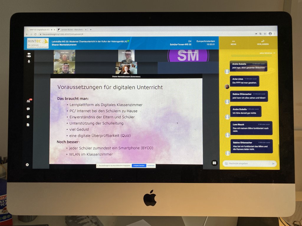 Nachdem nach und nach alle Teilnehmer auf der Plattform eintrafen, gab es zu Beginn eine kurze Begrüßung von Herrn Gollub, dem Vorstandsvorsitzenden von MINT-EC und unter der Moderation des Youtubers Jacob Beautemps, der über gesamten Tag die Moderation souverän leitete.