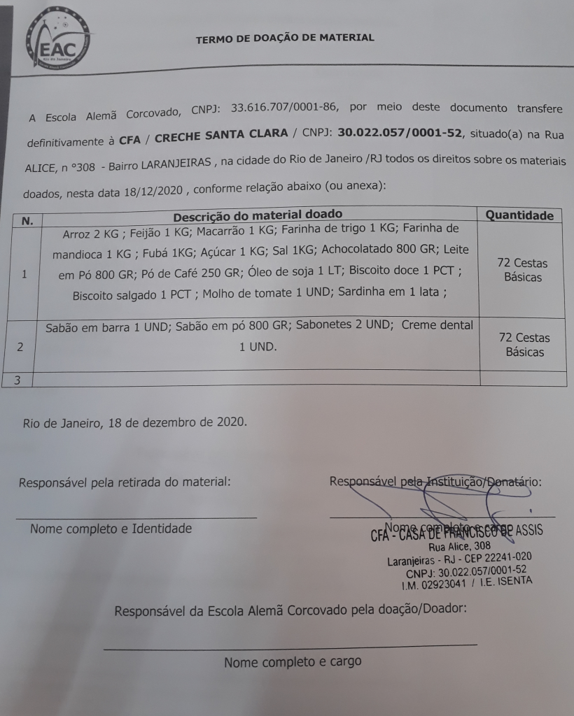 Im Einzelnen sind es diese Dinge, die angeschafft und in den jeweiligen Einrichtungen Creche Santa Clara, Creche Bom Samaritano, Casa Santa Ignez, Costure e Lactário pró-infancia, Escola Dom Cipriano Chagas u.a. in Rio verteilt wurden: Grundernährungsmittel (Milch, Kakaopulver, Bohnen, Nudeln, Zucker, Salz, Reis, Speiseöl, Mehl, Tomatenextrakt, Ölsardinen usw.), Dinge des täglichen Bedarfs (Seife, Spülmittel, Waschmittel, Kindermasken, Desinfektionsmittel, Hygieneprodukte usw.) Bücher, Spiele, Schreibwarenartikel (Blei- und Buntstifte, Wachskreiden, Wasserfarben, Knetmasse, Kinderscheren, Spiralblöcke, Farbkartons, Klebstoff usw.) und auch Laptops.