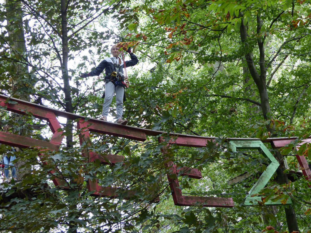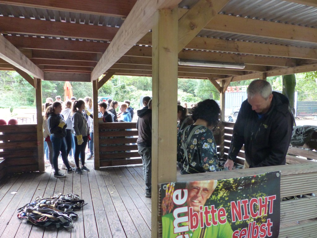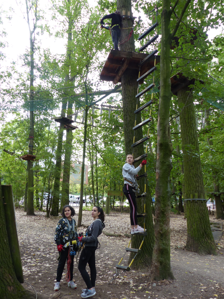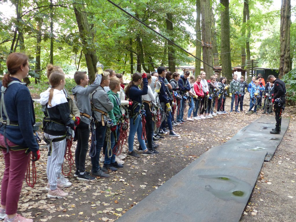 Der erste Blick in den Kletterwald ist noch ein skeptischer und nicht alle Erklärungen zur Handhabung von Handschuhen, Karabinerhaken und Seilen werden auf Anhieb von allen verstanden, weshalb es einiger Übersetzungen ins Portugiesische durch den Kollegen Ivan Millarch bedarf. Dann aber verläuft der Kletter-Spaß reibungslos. 27 kletternde deutsche und brasilianische Schülerinnen und Schüler und sogar die beiden Lehrerinnen Frau Ewald aus Rio und Frau Butenkemper trauen sich in die luftigen Höhen des Kletterwaldes am Rhein-Herne-Kanal (siehe Fotos).